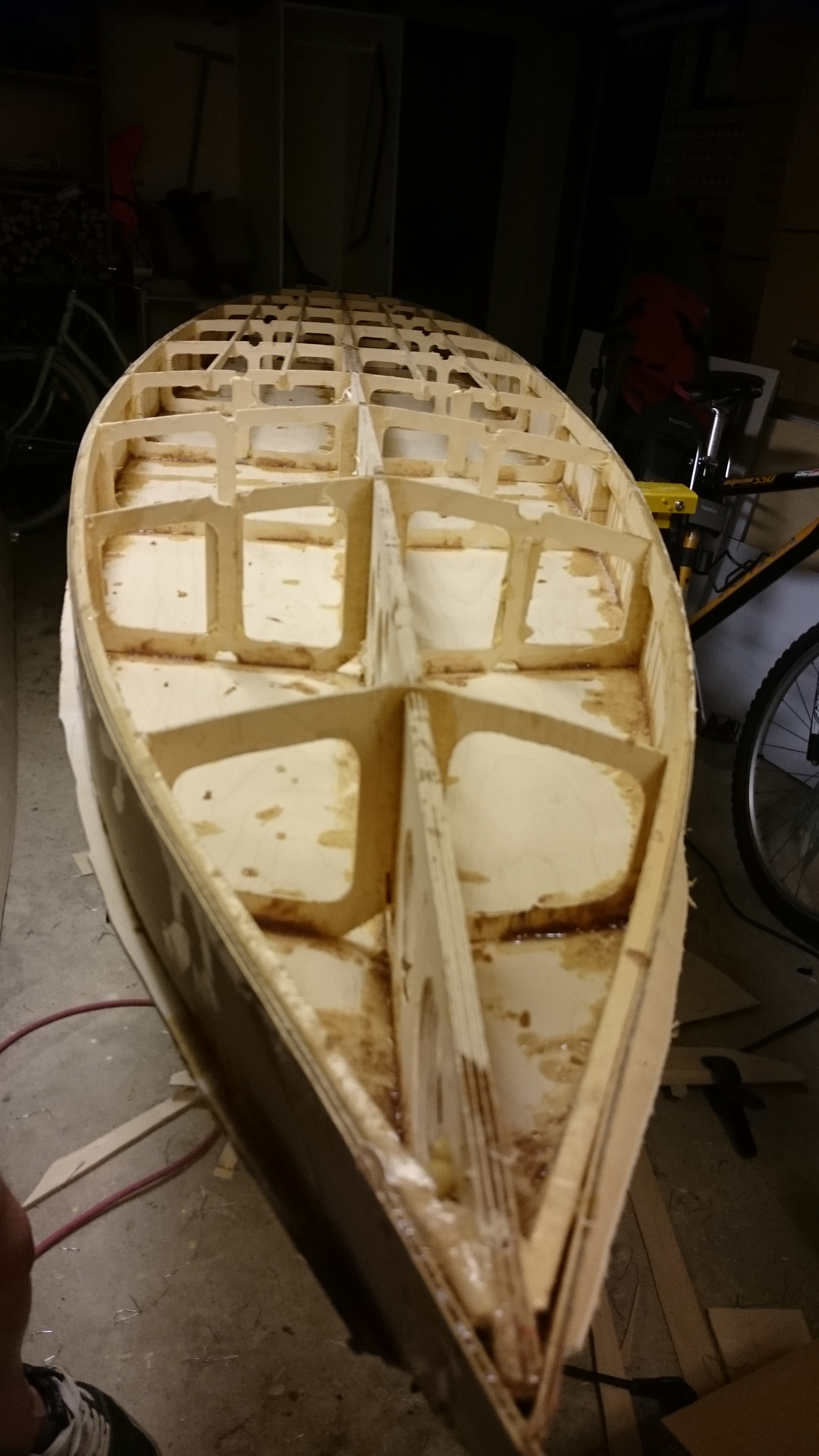 Först var det ju viktigt att få Stringern rak och sen skulle man ju få ihop fören så att allt såg fint ut…det gick väl så där. Blir väldigt tydligt att CAD och verkligheten sällan synkar när det väl gäller! Mitt val att använda björk väger ju in en del i hur lätt det är att tvista och böja plyfan. Med lite våld från en såg och lite för mycket våld av en tving som bröt av plyfans spets vid fören, så kommer det nog bli OK efter ”lite” epoxyspacklande! =) -