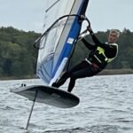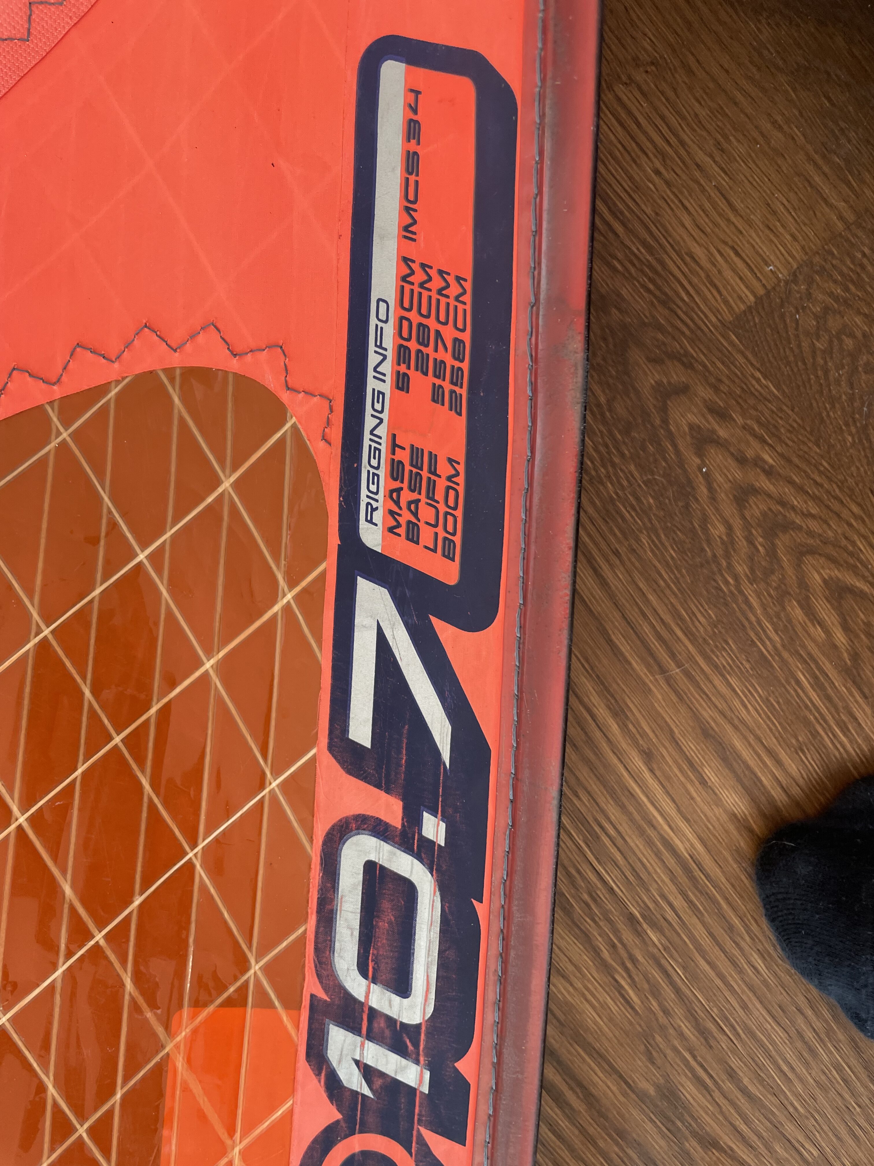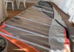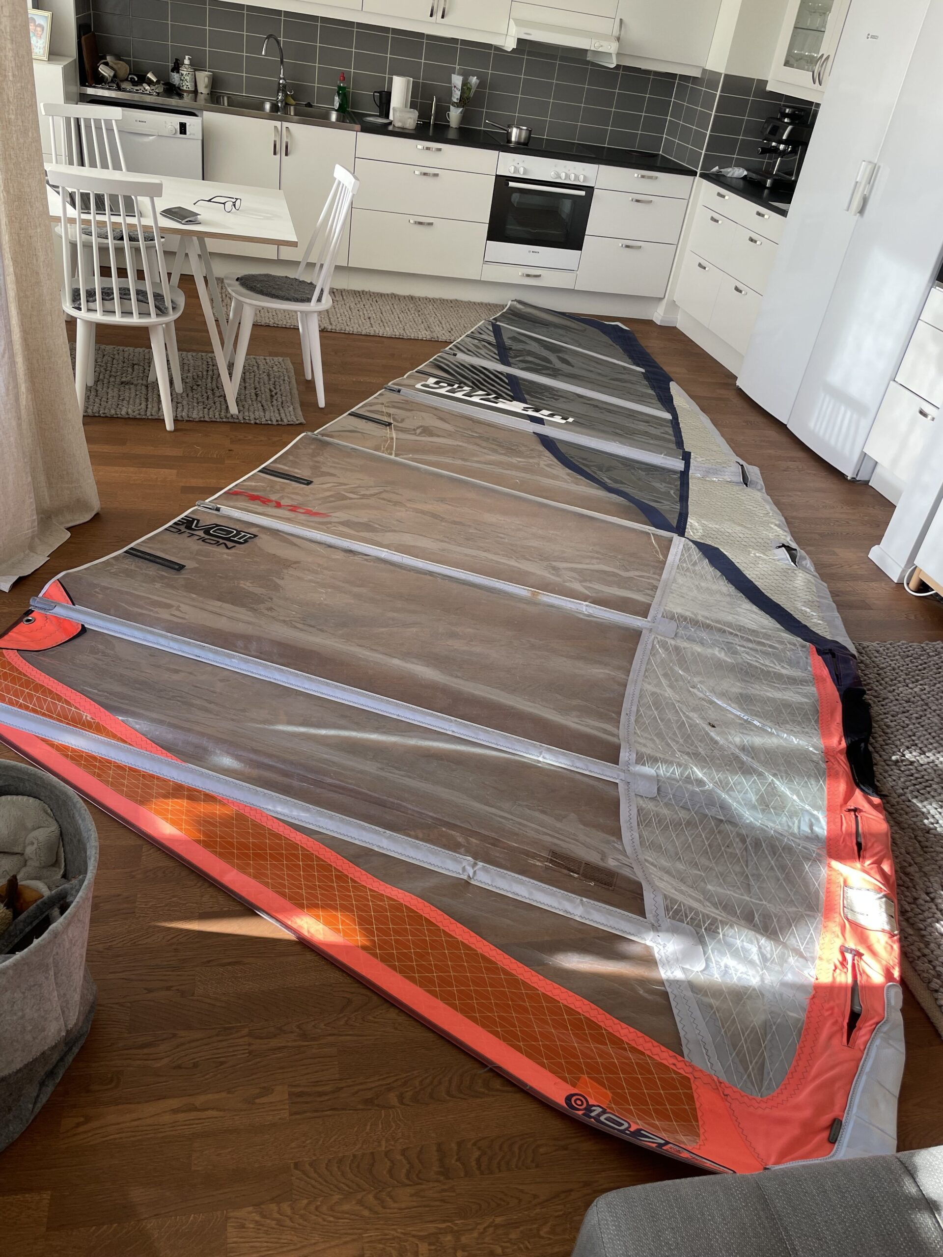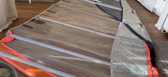 F d Formulasegel på 10,7 m2, omsytt till foilsegel ca 9,5m2. I helt OK skick. Ganska platt. Hämtas i Täby.