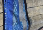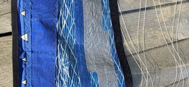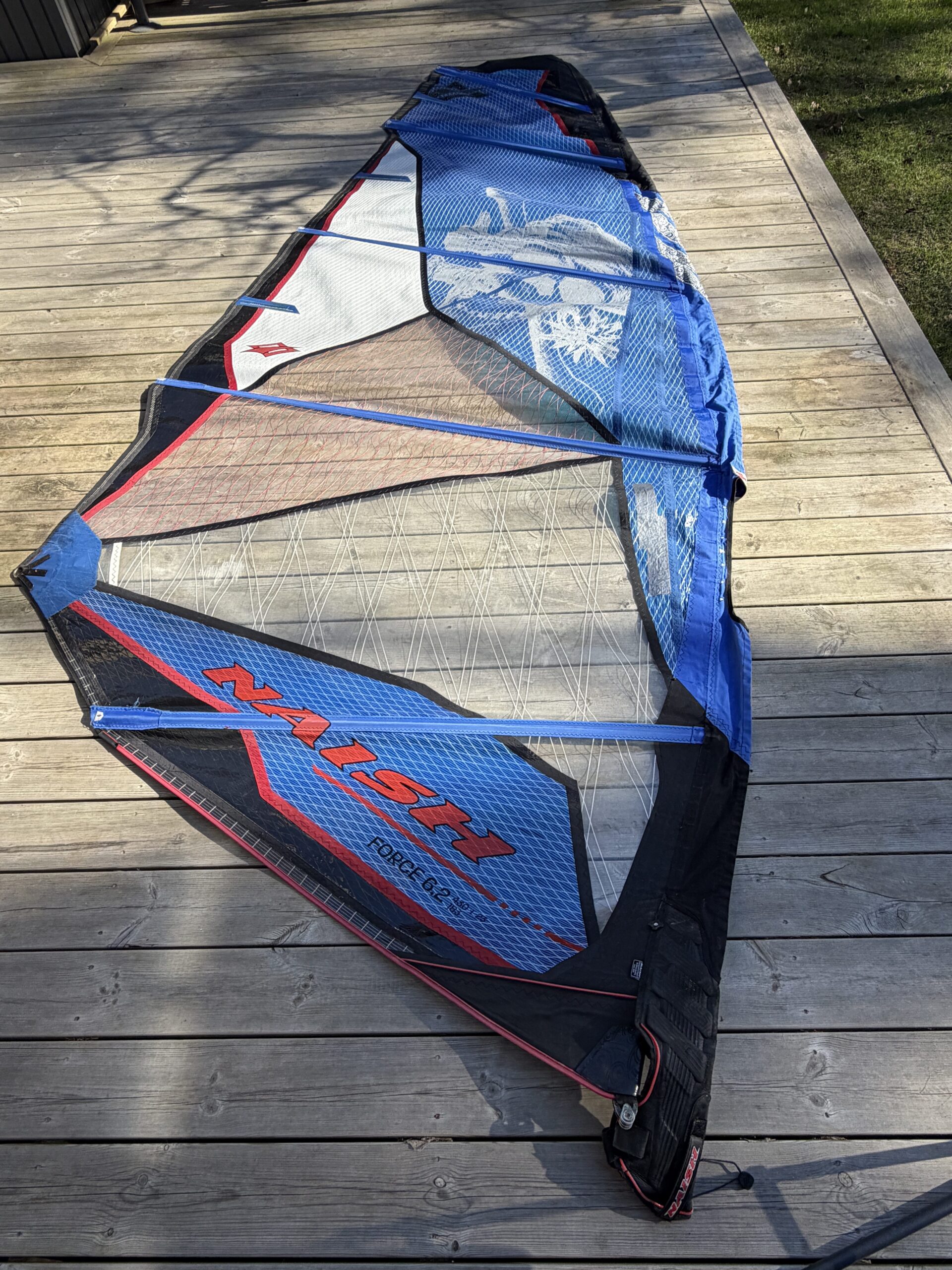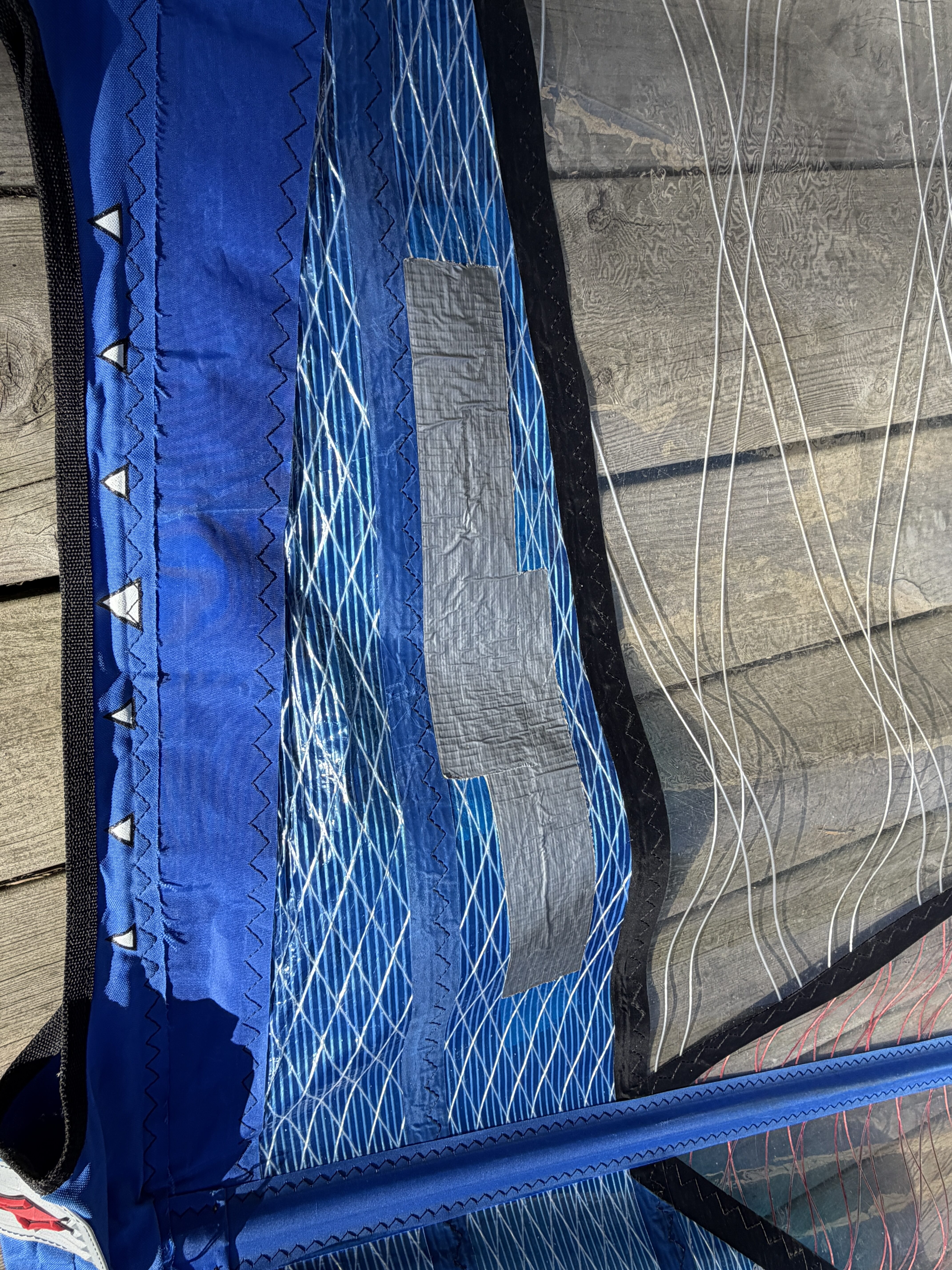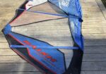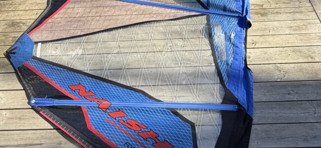 Seglet har en reva i en liten panel nära mastfickan som är lagad med silvertejp (se bild). Lagningen sitter stabilt och påverkar inte seglets prestanda. I övrigt i fint skick.