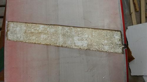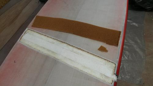blir även lite annorlunda då det är hc och inte divinycell.Tagit bort ytterlaminat och hc, hade det varit divinycell hade jag slipat genom laminat och sandwich för att få mjuka kanter men här har jag skurit då går dåligt att slipa i hc. Ska se om jag inte kan slipa laminatkanten lite sen.