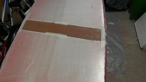 Fräst bort överflödig eps och pu-lim samt slipat rent. Kapat till ny hc. Möjligt att jag skulle tagit mer på kanten men tyckte inte epsn var så skadad där. Mer en rak spricka igenom laminatet ( som är rejält tjockt där, många lager:laugh:)
