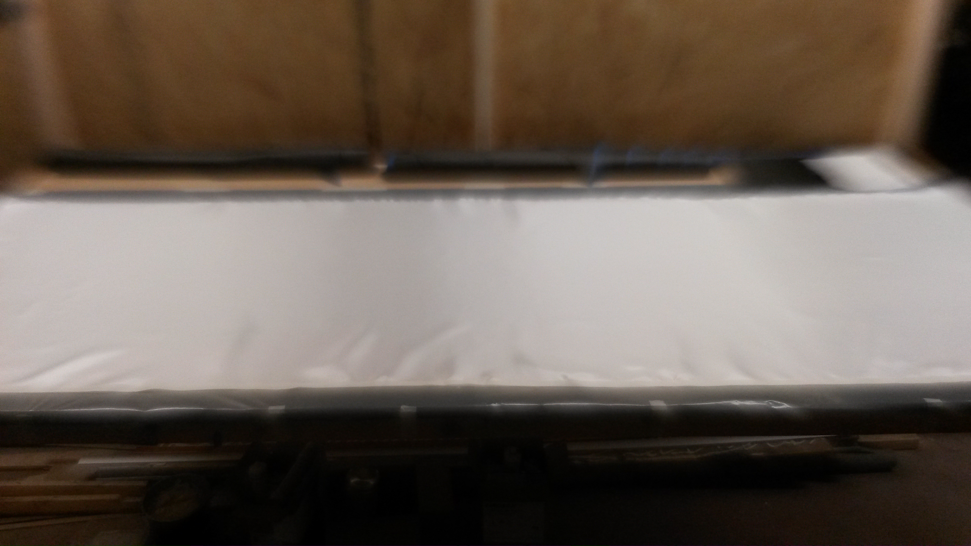 Och sedan utrullad på bräda. Kan ju tillägga att en sån här laminering är kanske inget man bör ge sig på som första projektEfter detta har brädan åkt in i vacuumpåse och in i värme 24h.