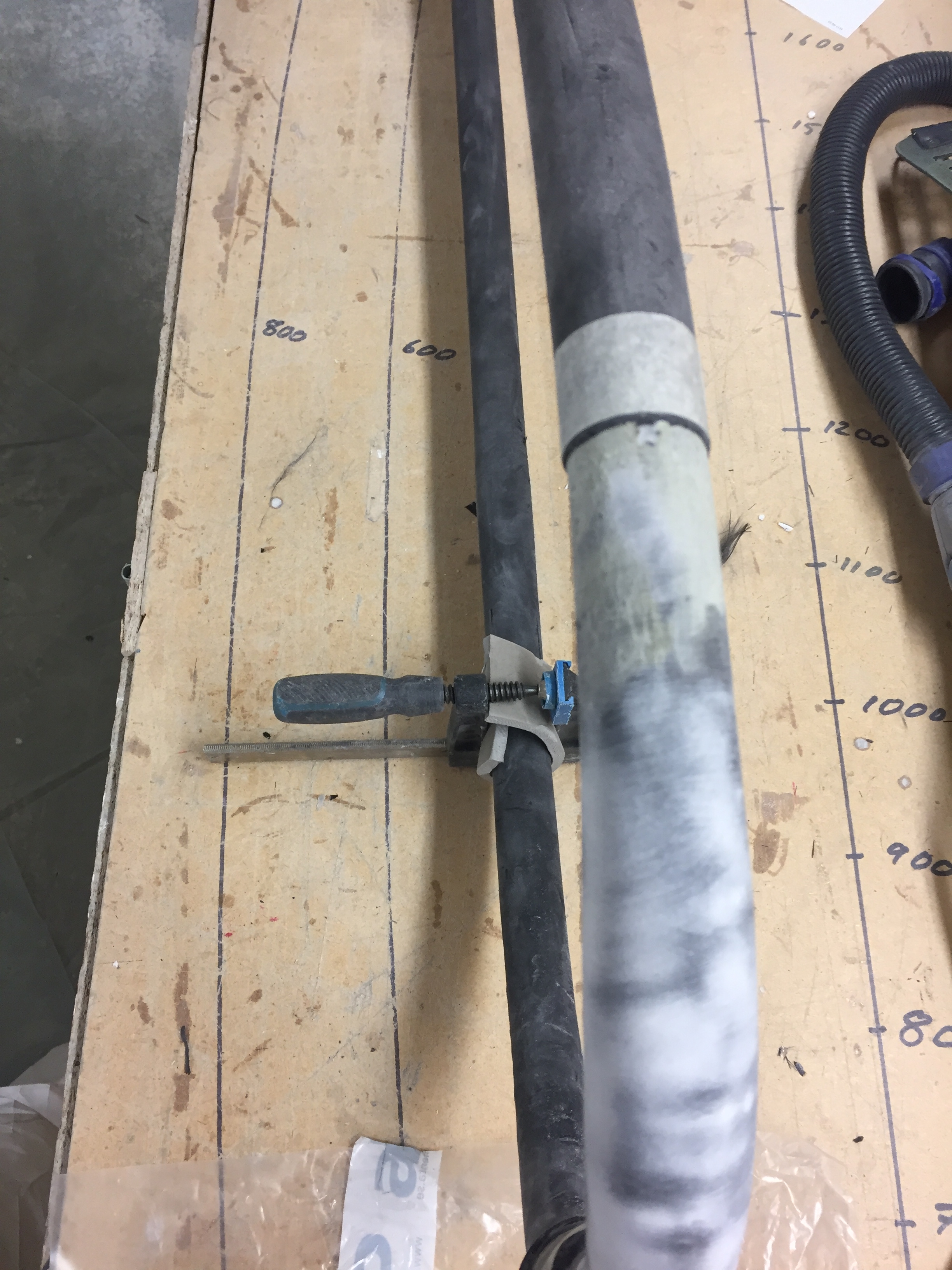 Bild 2: kolröret och bladdern på plats i bommen och bommdelarna fixerade i fixtur. Där det saknas material i bommen har jag satt en slang i lämplig dimension och sedan tejpat som fn, blir stora krafter när man lägger tryck i bladdern.