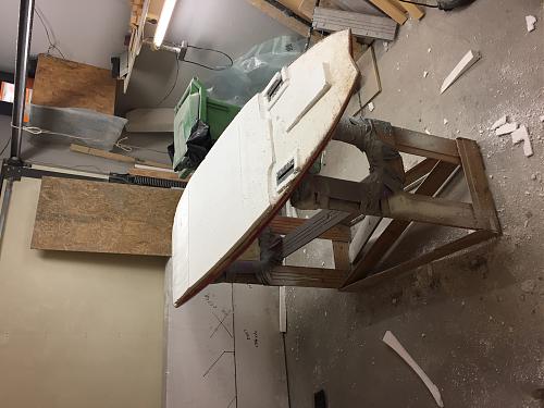 Har du anpassat höjden på träpallen för någon genomtänkt horisontell noll linje för rocker-scoop eller kör du bara på?Nej, brädan ligger helt löst på bocken. oftast räcker det. ibland om man skär hela blanks med glödtråd lägger jag en vikt på för att det ska ligga kvar.