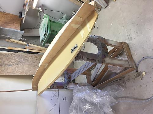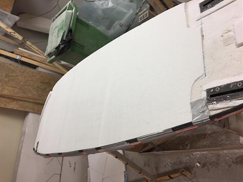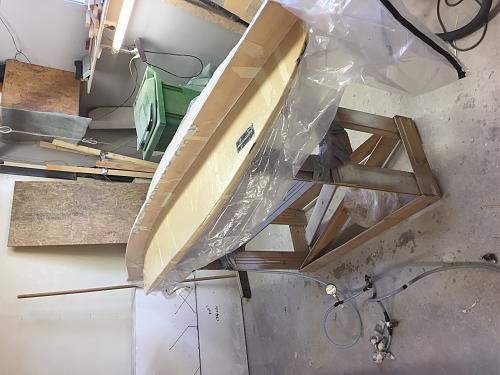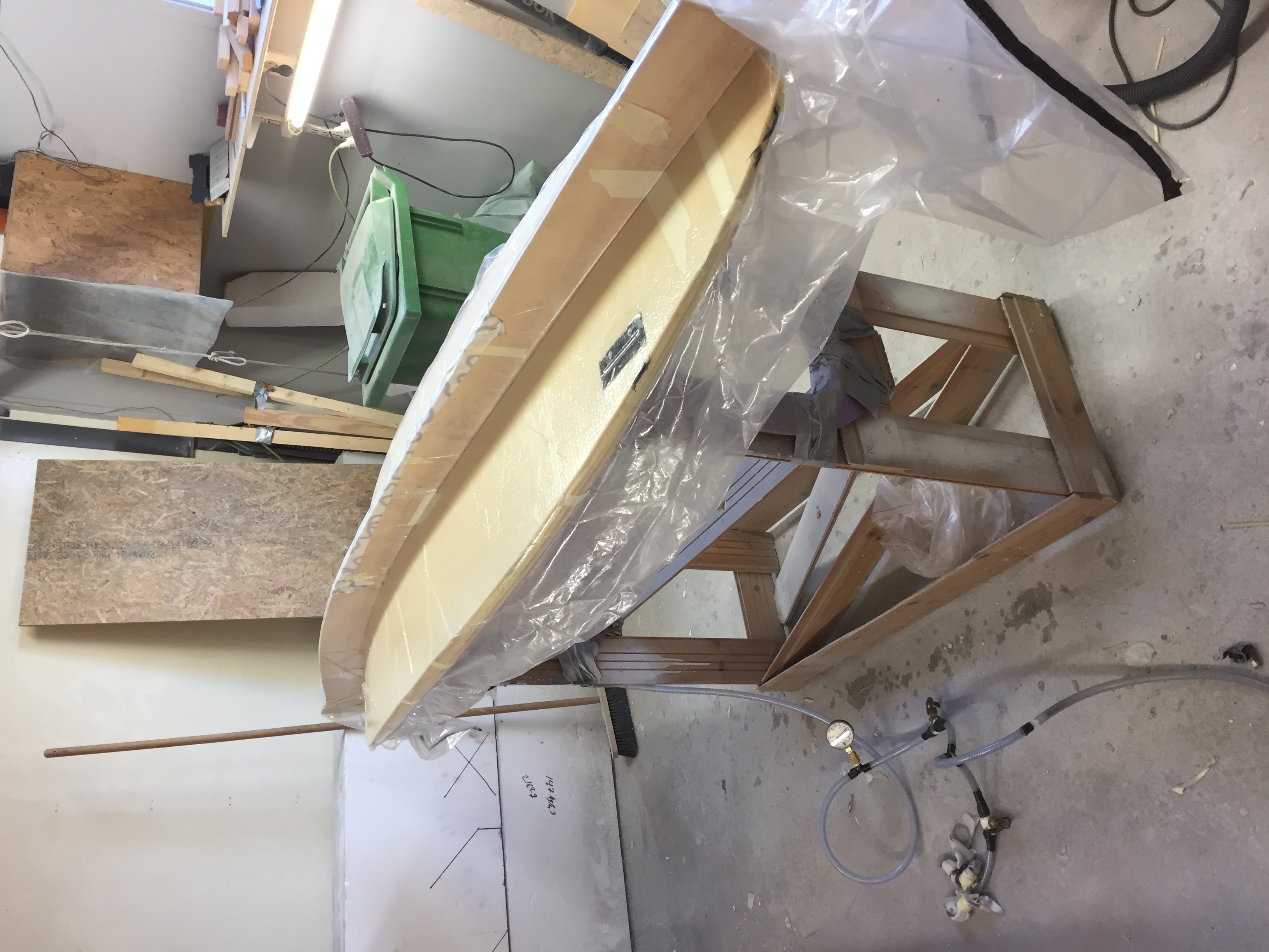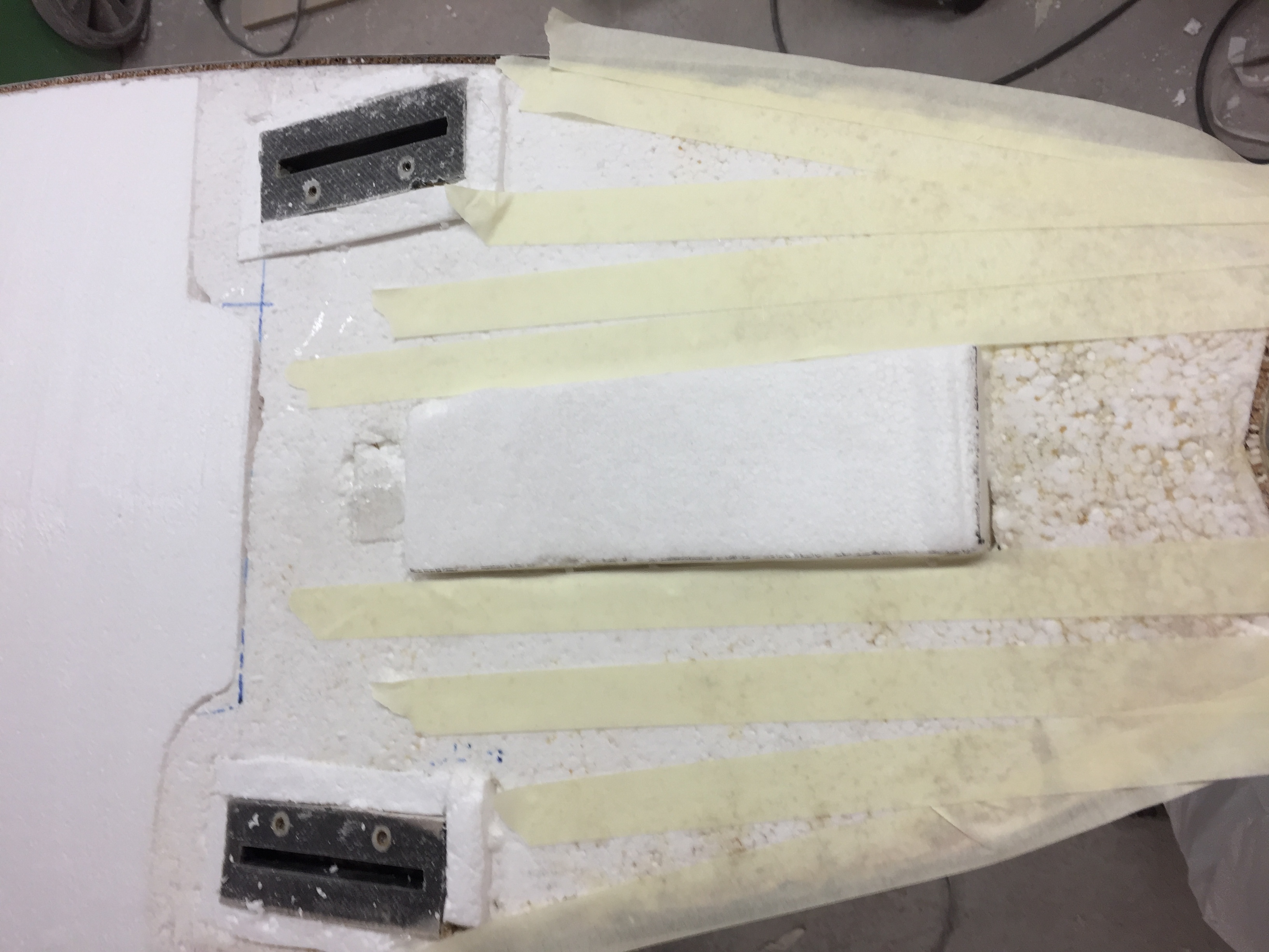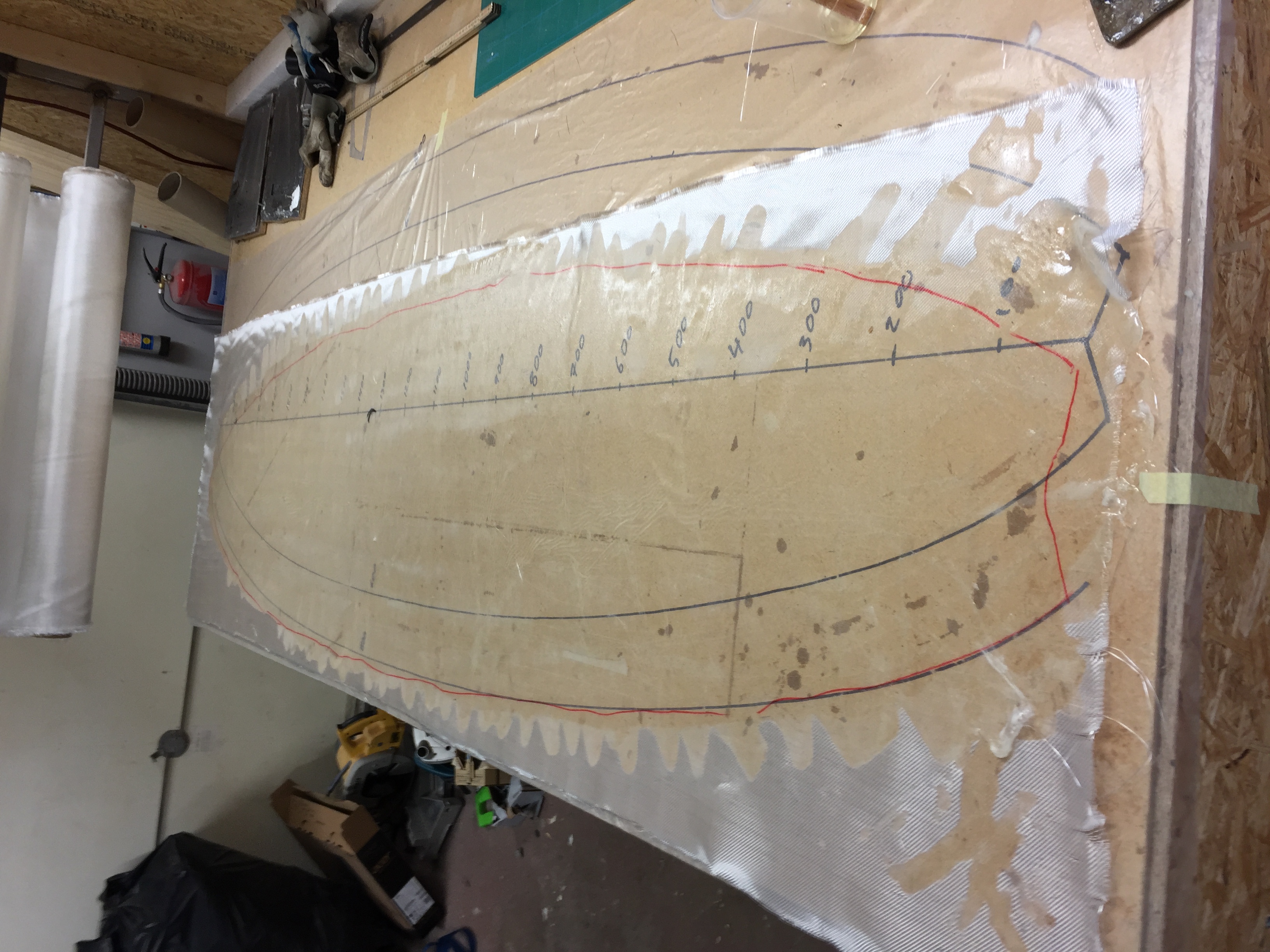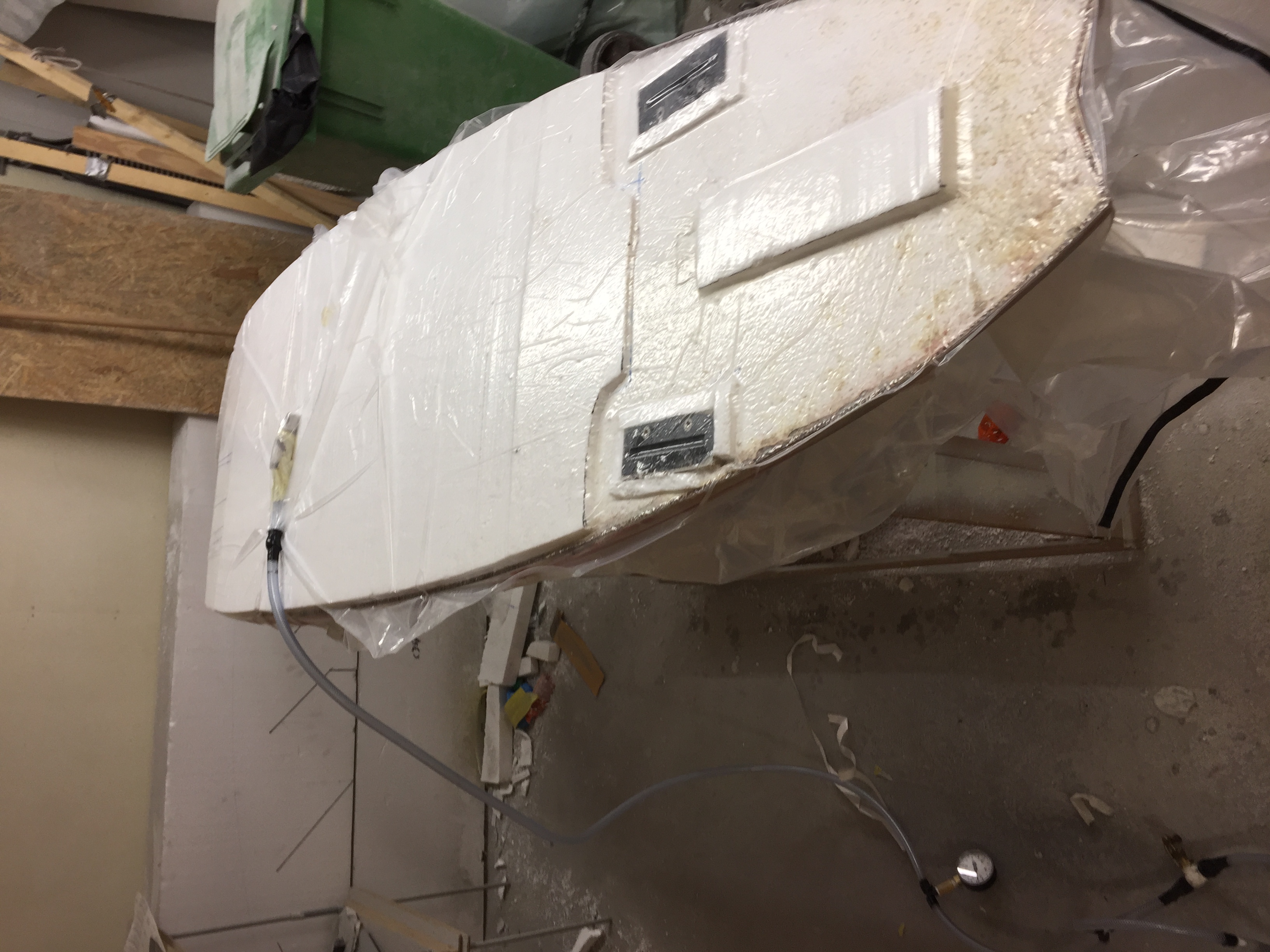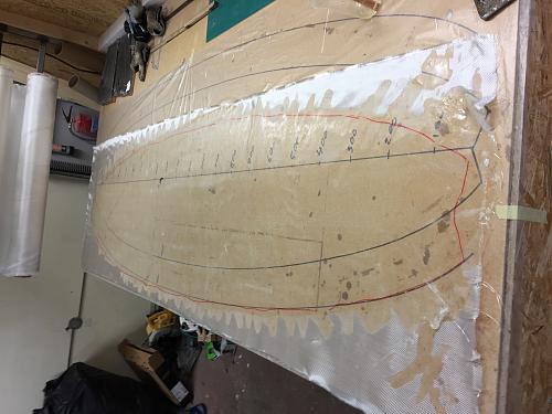 Lagt den förimpregnerade väven på brädan och sen sandwichen uppepå. Fixerat ned lite tejp. Även lagt med rockermallen för säkerhetskull. Tror egentligen inte den behövs då däcket är intakt och formstabilt.