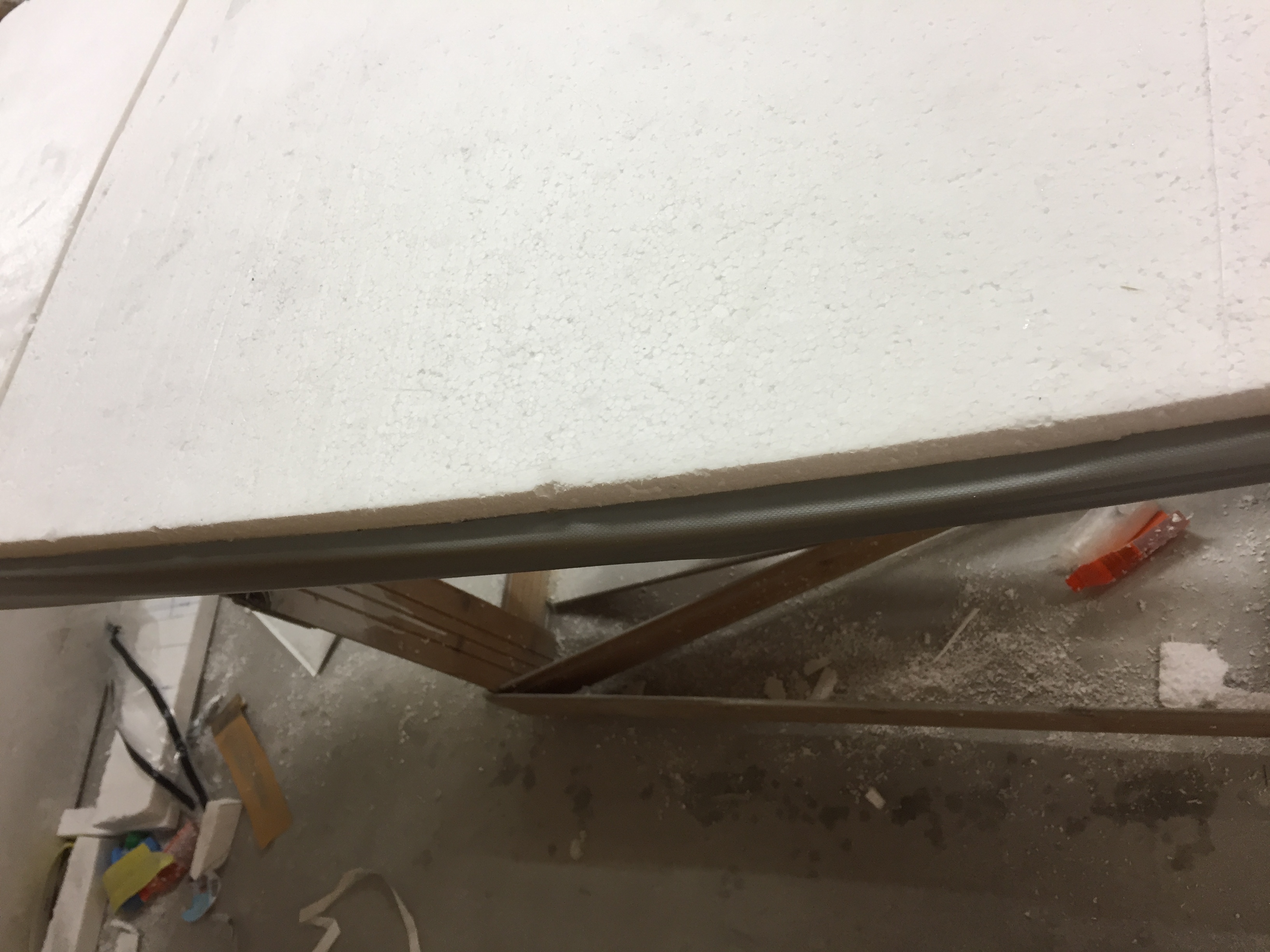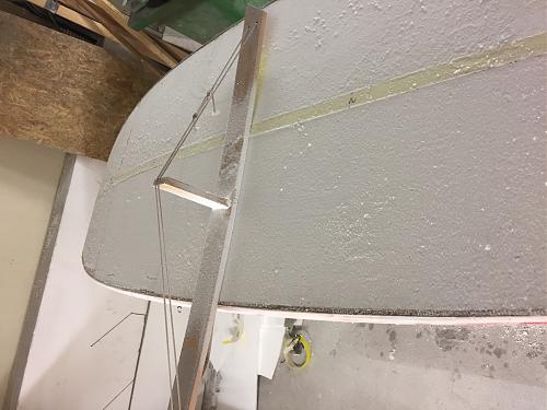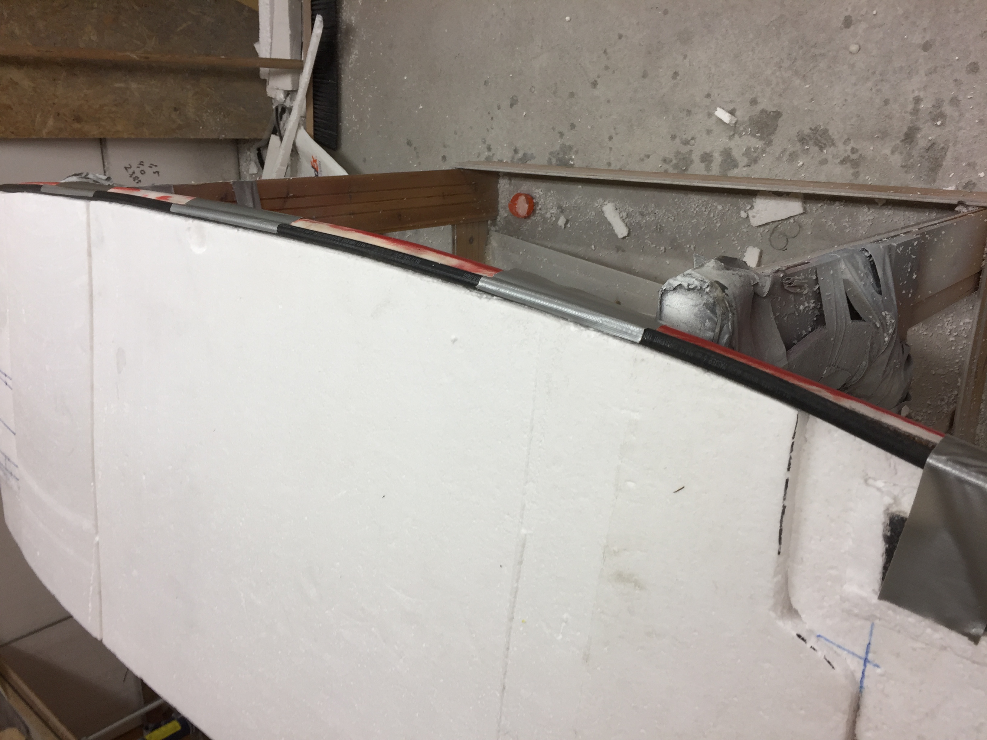 Först återskapar jag v:t genom att skära med glödtråd. Bottenkurvan finns kvar längst ut på kanten där jag fräst. Så på ena sidan lägger jag en tejp direkt på kanten så glödtråden glider lätt och inte hakar fast. På andra sidan tejpar jag fast en distans som har dubbla v höjden. I detta fallet passade det bra med en slang annars får man skära till en i tex divinycell. Sen är det bara att skära med glötråd. När ena sidan är gjord byter man plats på tejp och distans och skär andra sidan.