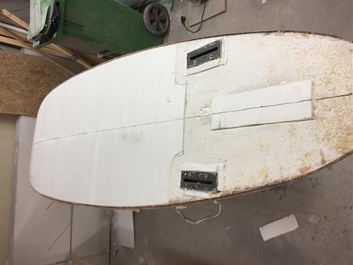 Markerat var T-balkarna ska ligga o skurit spår för demNästa steg blir att laminera fast sandwichen