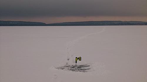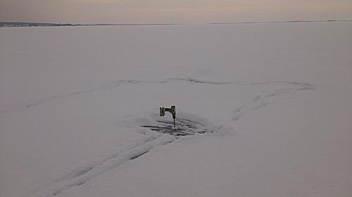 isen ligger med snö ovanpå vilket gör att tillväxten är låg. Det är ca.6-7cm is vilket är i minsta laget . Men ge det ett par dagar till så blir det bra.Utanför viken är vattnet delvis öppet, denna tunna isen i kombo med snön gör att råkar bildas hela tiden och känns helt främmande just nu.