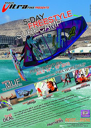 Together with our international team riders we have the ultimate offer to really boost your freestyle skills. Our offer explicitly addresses freestyle rookies as well as the most advanced riders who would like to perfection the latest tricks of the trade! The 5-day training camp in Sotavento, Fuerteventura from 14 to 18 July (costs 299 Euros including a MUF freestyle fin of your choice!) will be run by Adi Beholz who – apart from his extremely high sailing skills as a PWA sailor – also has vast experience as a windsurf instructor and is commited to freestyling like no other!Especially for our female participants we have included the current PWA Freestyle World Champion Sarah-Quita Offringa and the 3rd placed Arrianne Aukes into our instructor team. Vice World Champion 2010 and winner of many world cups Taty Frans plus Yegor Popretinskiy (top 15 PWA-Freestyler and windsurf instructor) complete this absolutely amazing international and multilingual teaching team. The learning will be conducted in small groups built according to the participants´ requirements. Tips on gear setup (rig, board, fins) will round off the practical side.MUF staff Marcus Kleber will be there to assist you in all practical matters on Fuerte. He is an avid freestyler himself and can also give excellent advice on fin tuning.You can only book the camp excluding all other travel services here. The price of 299 Euros includes a freestyle fin of your choice that you will receive at the beginning of the camp.You can book further travel features (flight, transport of gear, accommodation, rental car) yourself or contact our partner travel agent Sönke Biehl of Reisebüro Biehl for a matching package. We have reserved accommodation for the event at the hotel Esmeralda Maris until 28 April. The hotel is situated within walking distance to the camp (http://www.esmeralda-maris.com).Our partner Sönke Biehl is a very enthusiastic windsurfer himself and a Fuerte-expert. He will be delighted to help you with all your needs. Those are his contact details: Mail: [email protected]This e-mail address is being protected from spambots. You need JavaScript enabled to view it , Phone: +49 4814 695-43.
