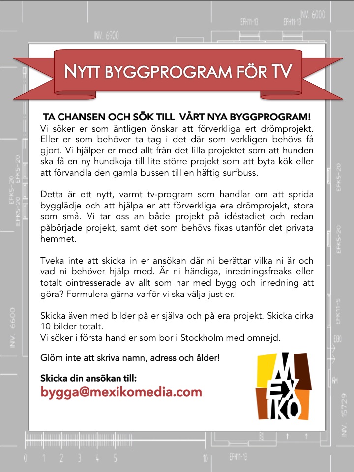 Tveka inte att skicka in er ansökan där ni berättar vilka ni är och vad ni behöver hjälp med. Är ni händiga, inredningsfreaks eller totalt ointresserade av allt som har med bygg och inredning att göra? Formulera gärna varför vi ska välja just er.