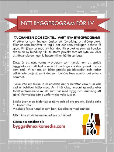 Vi söker er som äntligen önskar att förverkliga ert drömprojekt. Eller er som behöver ta tag i det där som verkligen behövs få gjort. Vi hjälper er med allt från det lilla projektet som att hunden ska få en ny hundkoja till lite större projekt som att byta kök eller att förvandla den gamla bussen till en häftig surfbuss.Detta är ett nytt, varmt tv-program som handlar om att sprida bygglädje och att hjälpa er att förverkliga era drömprojekt, stora som små. Vi tar oss an både projekt på idéstadiet och redan påbörjade projekt, samt det som behövs fixas utanför det privata hemmet.