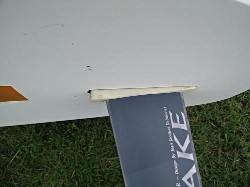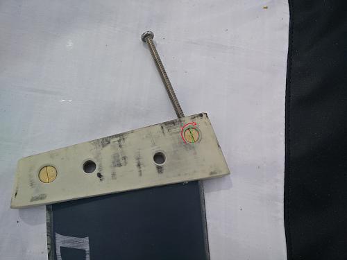 Jag löste problemet åt min grabb genom att ta fram borrmaskinen och vinkla upp hålet längsleds i fenan så att skruven kunde gänga in i fenan med korrekt vinkel.
