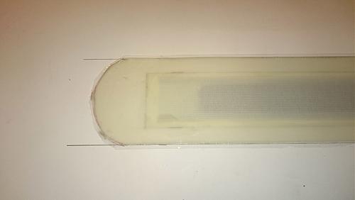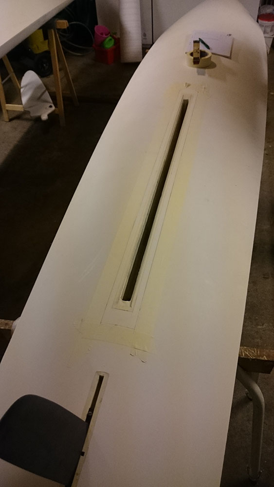 Maskering. Lät tapen sitta kvar vid limningen. Drog bort den yttre innan limmet härdat helt, den inre tapen fick sitta kvar och får lossna av sig själv med tiden bäst den vill. Maskerade 1 cm framför och bakom centerbordstrumman för att ge de stela mylarflapsen lite längre sträcka att öppna sig på för centerbordet: