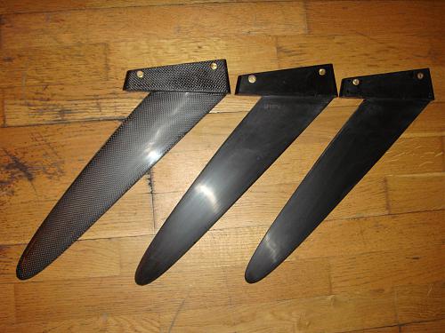]Fick idag hem de tre första ”proto” fenorna. Ser kanon bra ut, men inte 100%, men det är ju bara på ”försöksstadiet” än så jag är mycket nöjd med hur bra fenorna ser ut! 45 graders raket, tjockaste punkten låååångt bak (ca 50%), tunn profil (runt 8mm). Fenorna är samtliga runt 28.5 djupa. Den längst till vänster är styvast (helt i kolfiber), den i mitten är mjukare (kolfiber + basalt), o den längst till höger är mjukast (mest basalt). Skillnaderna i styvhet kan man känna tydligt, ingen av fenorna är dock ”spagettimjuka”. Återstår att se hur bra/dåligt de funkar :grin:. Min gissning är att de kommer inte klara större segel än max 7.9, men ges det tillfälle kommer jag testa med 9.3 med… Faller de bra ut så kommer de finnas i ”perfekt” finnish längre fram…