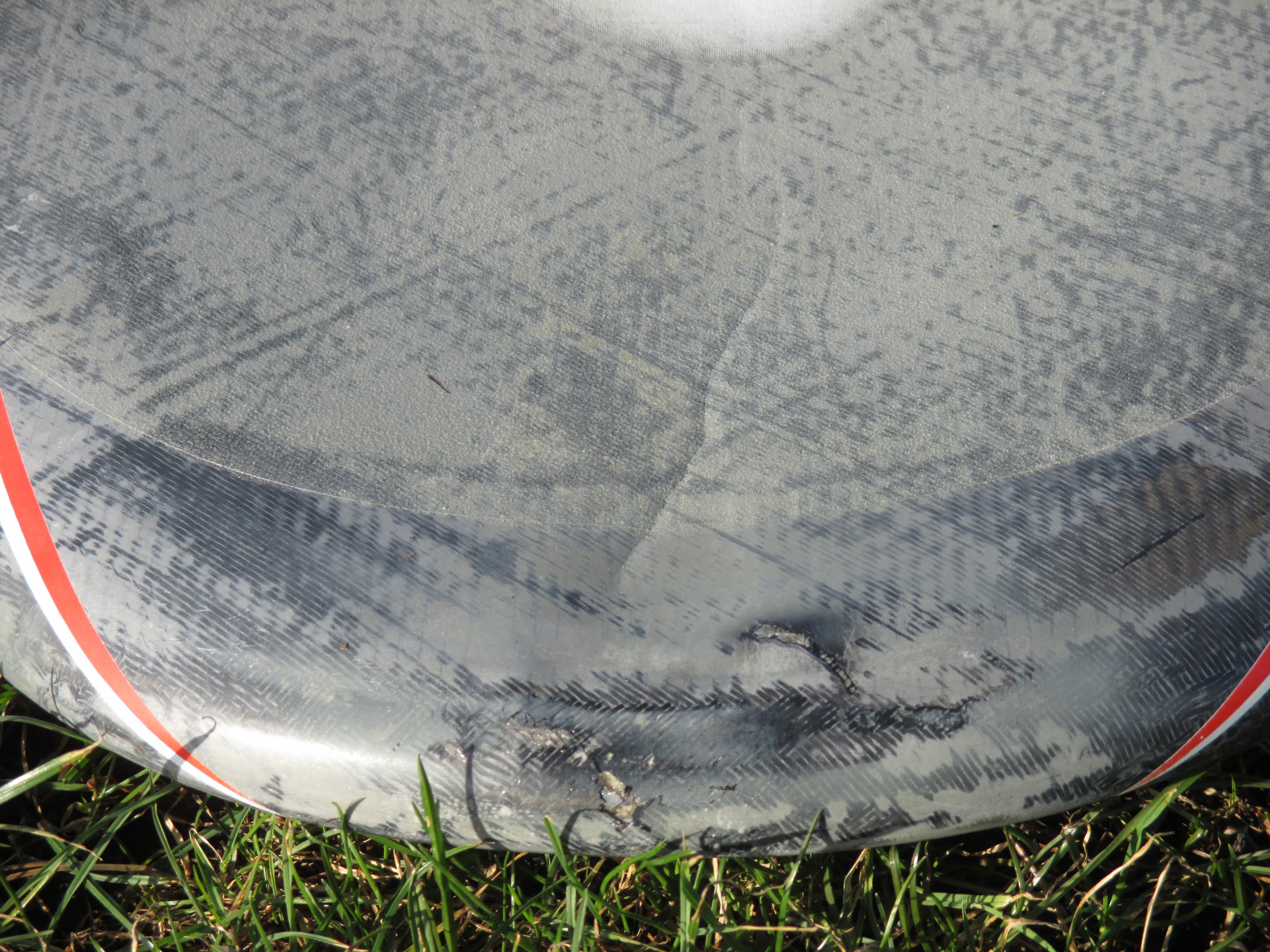 When you repair the nose you must repair that crack as well. It’s for sure a crack and if you press with the thumb you will feel a softness around it. You can repair it with two layers of fibers on top of it and if it is very soft you can inject epoxy (se: epoxi) to stiffen it up from the underside.