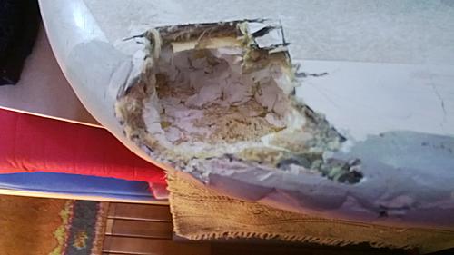 2. För att ersätta allt det svunna kärnskummet funderar jag på att antingen skära ut en kloss från en skiva polyuretan-skum och slipa till den så den passar någorlunda, och ankra den på plats med epoxi +mikroballonger, eller är det kanske bättre att köpa 2-komponents PU-skum på sprayburk?