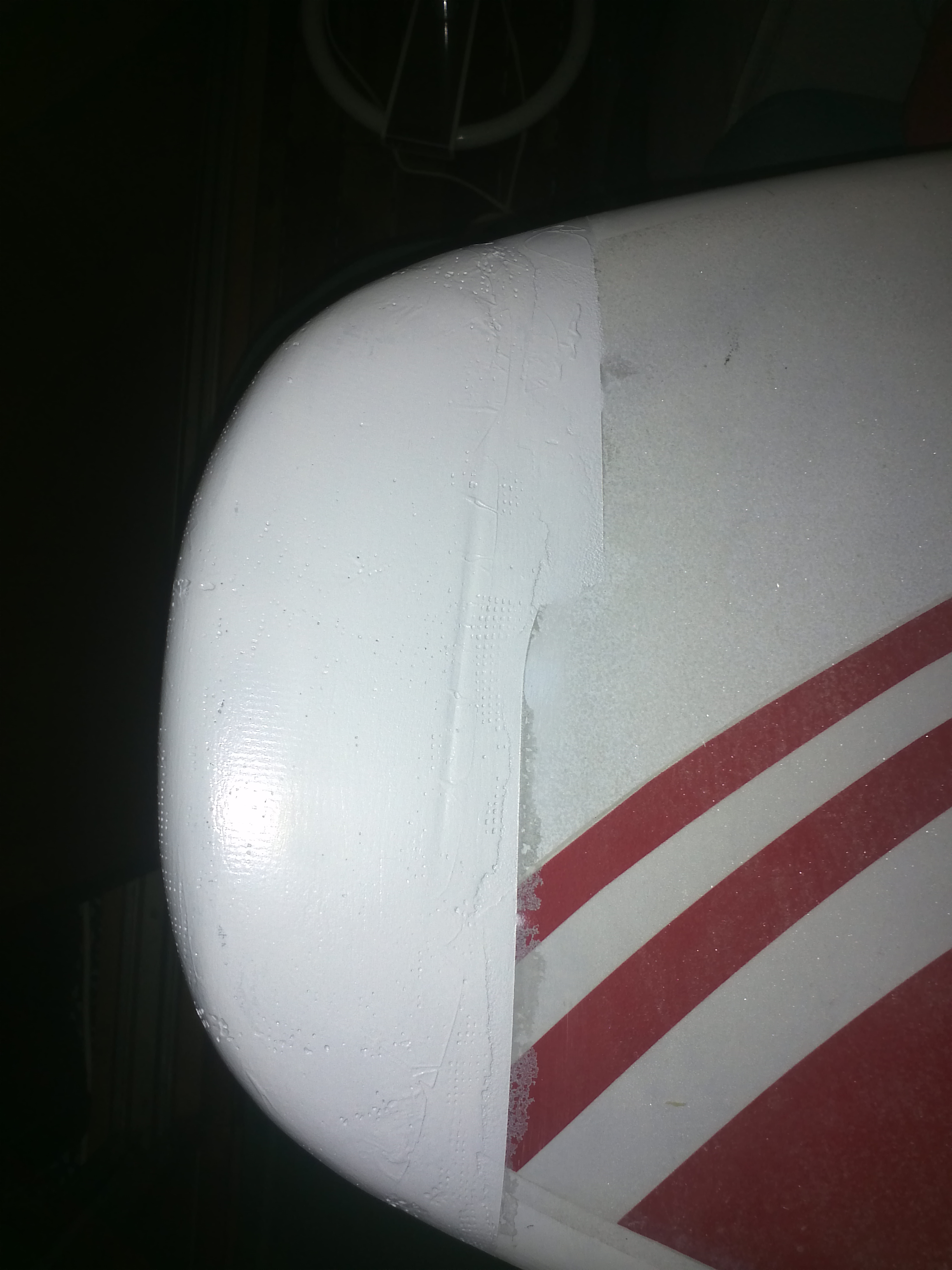 Efter diverse kastfall har vi nu en bräda som fått in vatten genom nosen, vi köpte den nyligen begagnad så vem vet vad som hänt med den innan, iaf så slipade jag bort allt det mjuka, skumkärnan under skadan var även den helt förstörd och mjuk så jag grävde o grävde, och har nu hål rakt igenom brädan till undersidan. Skummet runtom är dock intakt och torrt.