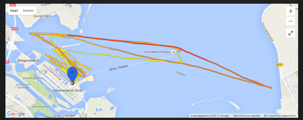 First I did some crosswind reaches, later I thought lets go a bit towards Pampus. I was halfway faster than expected (soo, I thought why not go all the way). On this first reach I used the daggerboard and a 3/4 front position of the masttrack. Now I analysed the ”upwind speed” (speed against wind) was on the long run approx 5 km/hour. While the short reaches near Pampus turned out to be nearly average 10 km/hour, I remember to push harder near Pampus, this was because I just didn’t make it. It turns out to be that pushing as tight as possible was faster (compared to balancing upwind).[TABLE=”class: tr-caption-container, align: center”]