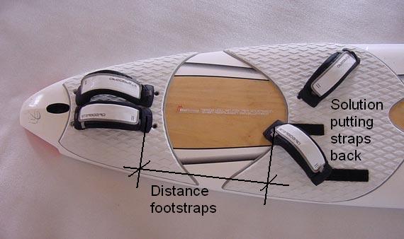 Some boards don’t have a good front strap position, in these cases putting the rear footstrap a bit forward helps. Between distance footstraps look for 36-40cm, 36cm for ultimate flat water speed till 40cm overpowered chop big slalom. A solution to put the straps back without an insert.