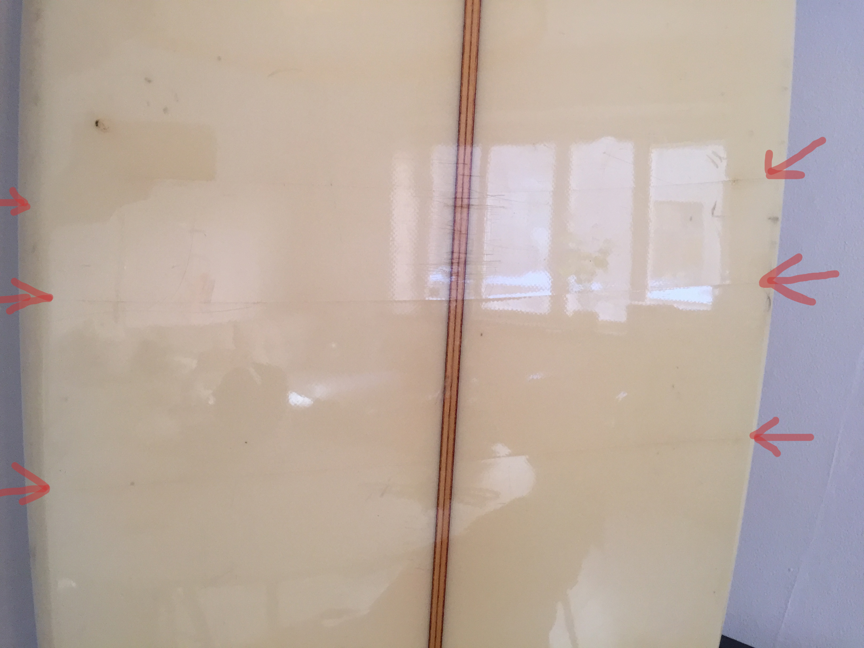 Kom över en bräda som tyvärr har brädan tre långa streck/sprickor som går tvärs över brädan. Ingen av sprickorna har gått igenom eller tagit in vatten men känns ifall man drar fingret över dem samt syns i rätt vinkel.