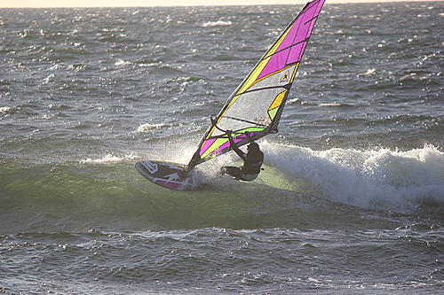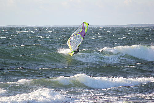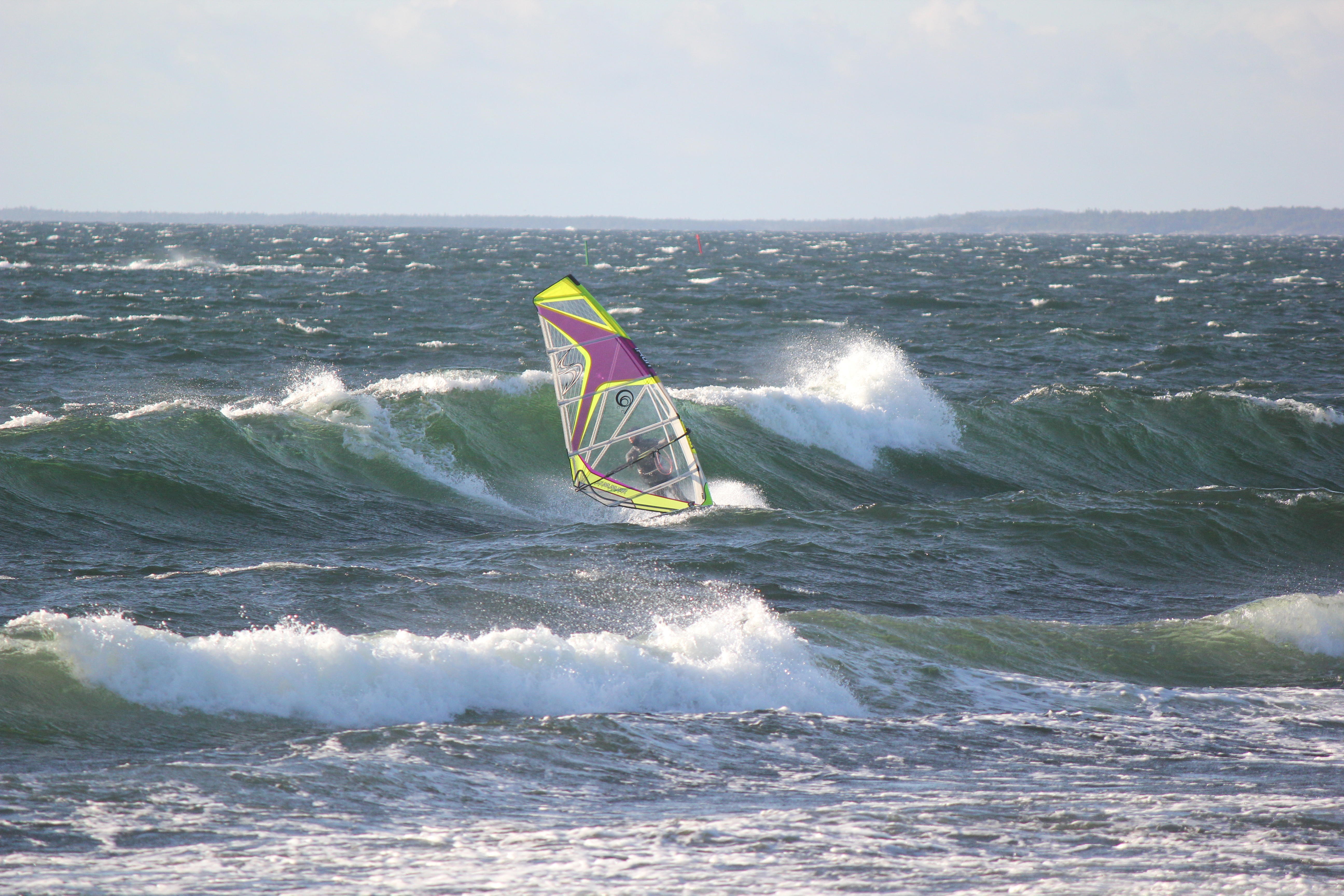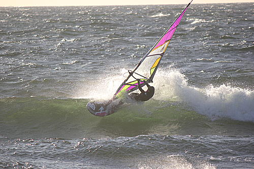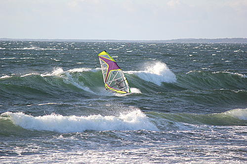 Var på stenstrand strax efter kl. 7 . Det var oväntat platt och vinden max ett par m/s. Åt frukost i soluppgången och var just på väg att vända hemåt när det började fläkta lite från V. Vågsizen tycktes gå upp även den. Bestämde mig för att leva på hoppet. Riggade och guppade ut, galet vackert. Vinden fyllde i alltmer och kl. 9-11 var stenstranden riktigt riktigt najs! Det var inte särskilt stort, guppa ibland, full gas ibland, men ack så cleant och framförallt så lätt att hitta och komma med bra vågor. Tippar på att vinden låg kring 7-10 m/s och uppåt 300 grader mot slutet.Synd att inte fler chansade!
