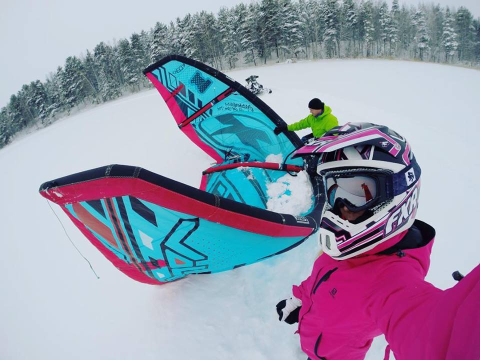 Jag skaffade mig en 2011 f-one Volt som ska vara snäll mot nybörjare så jag kan utvecklas – tänkte jag. Nu kom snön och dessutom två dagar med vind och vi tog skotern ut till mitten av sjön för att testa. Jag riggade kiten, tog på mig snowboarden och kom iväg ganska bra. Men kiten tappar kraft varje gång jag drar bommen mot mig och släpper jag ut den på helt raka armar så får den enorm kraft och lyfter mig. Kraschade flera gånger av förvåning. Eftersom det kommit 50 cm snö så borras man ner rejält i krascherna och jag orkade helt enkelt inte köra så länge i kylan, med all snö över mig.