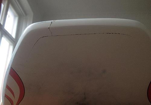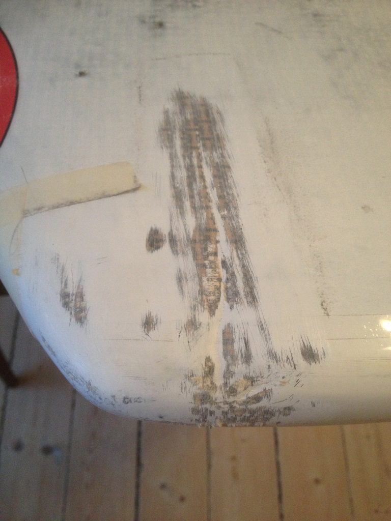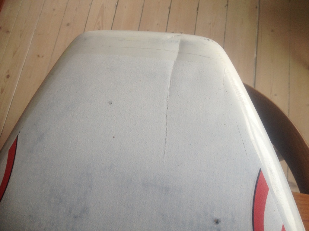 Skate’n nedan har fått en liten tryckare av masten på ovansidan, och spruckit både på över- och undersida.Efter moget övervägande har jag beslutat mig för att fixa detta själv (första brädlagningen alltså…), och har införskaffat både material och råd och tips av Svenne. Tyvärr sviker mig minnet lite grann och jag är osäker på hur djupt jag kan/måste slipa ner. Uppenbarligen har glasfiberlamineringen spruckit, utgår dock ifrån att kärnan är tämligen oskadd. Problemet, som Svenne mkt riktigt påpekade, är att när man slipar lite djupare så börjar glasfiberna att ”fransa sig” och det är tydligen inte önskvärt. Approachen är annars att göra en lite djupare, ca 2cm bred ”ränna” som sedan fylls med epoxy/microballonger och sedan armeras med två lager fiber. Efter detta sedan 1-2 lager fiber över det lite bredare området, ca 6 cm brett. Samma sak på undersidan.