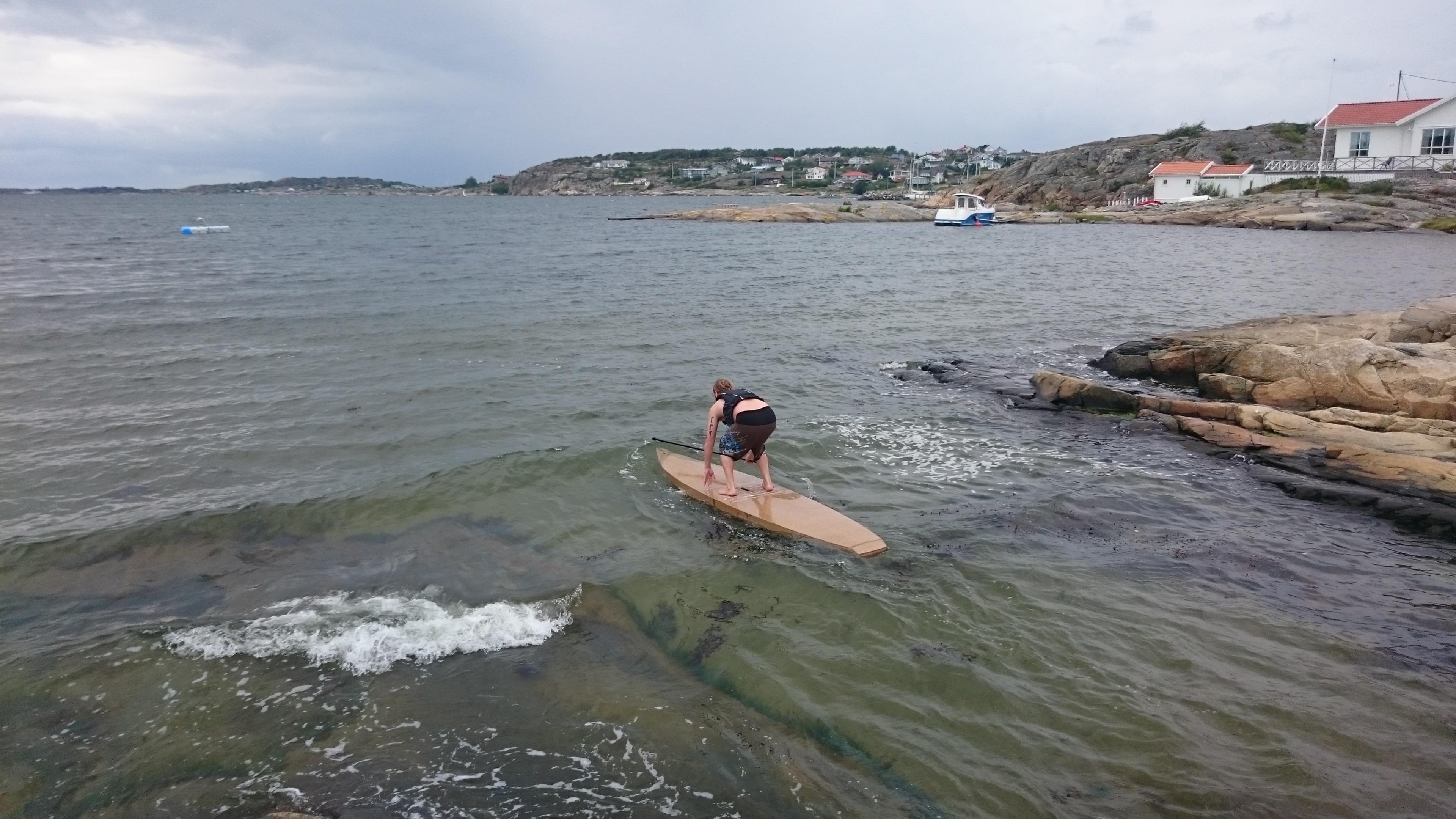 Tyckte brädan skötte sig galant! Den drar lite till höger och jag insåg att fenboxen hamnat lite snett (blev lite hetsigt och slarvigt i slutet för att få i brädan). Dock inget som stör direkt så det får bli höstens justering. Jag slipper iaf bygga en ny bräda då jag är riktigt nöjd hur den hanterar sjön.